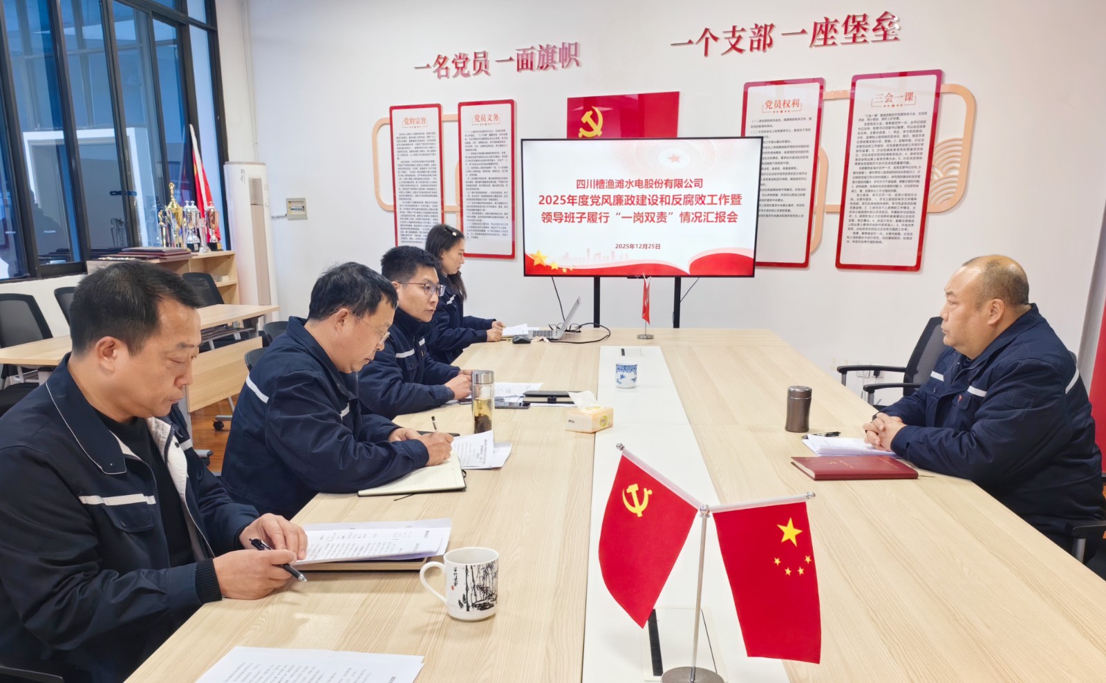 为深入贯彻全面从严治党要求,持续推动党风廉政建设和反腐败工作向纵深发展,近日,槽渔滩公司党委召开2025年党风廉政建设和反腐败工作暨领导班子“一岗双责”履行情况汇报会。会议由公司党委副书记、工会主席陈尧主持,公司领导班子成员及纪检工作部、党群工作部相关人员参加会议。
