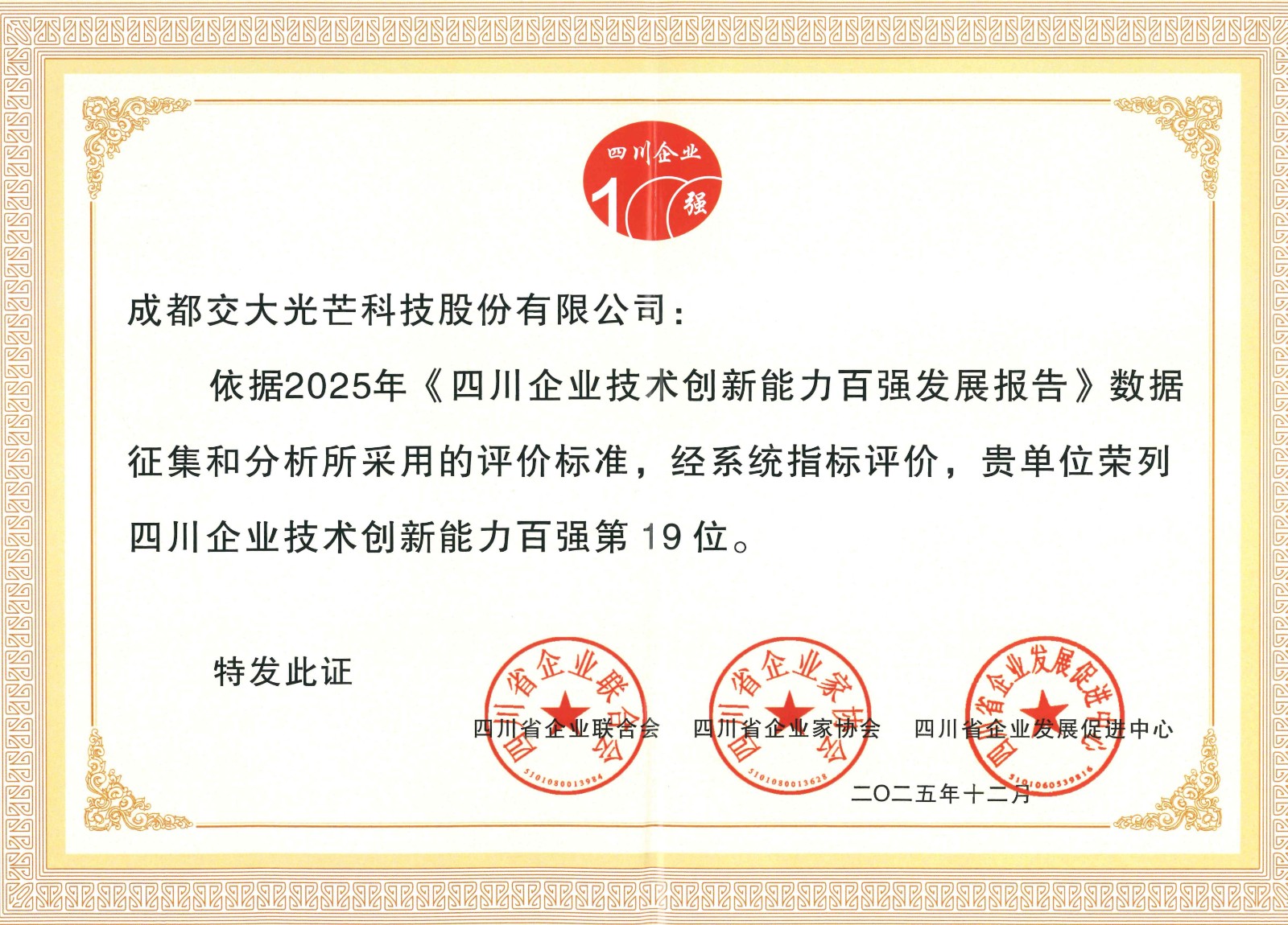近日,2025年四川企业技术创新发展大会在成都召开,川投能源所属交大光芒公司获评四川企业技术创新能力百强企业(第19位)和四川企业发明专利拥有量百强企业(第25位),这是交大光芒连续四年荣获“双百强”企业,公司首席专家、副总经理陈奇志获评“2025年四川企业技术创新突出贡献人物”。